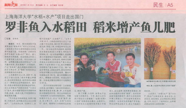 晚报讯(记者 俞陶然) 本月,联合国国际开发署资助的“稻鱼共生”项目正式启动,上海海洋大学的专家即将前往非洲发展中国家马里,在那里推广水稻田里养罗非鱼的“水稻+水产”模式。据上海海洋大学教授、农业部渔业科技入户首席专家王武介绍,对比试验已证明,这种模式能达到水稻和水产互利共赢的结果,即水稻增产、不用施肥,产出“有机米”;鱼儿则能吃掉稻田里的孑孓和杂草,在“增肥”的同时防止非洲国家的疟疾蔓延。