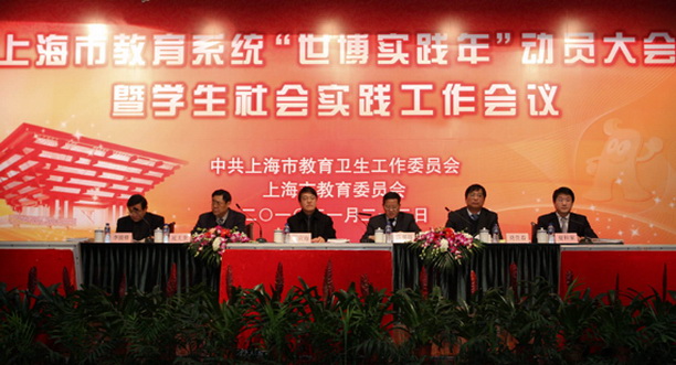 2010年1月22日下午,上海市教育系统“世博实践年”动员大会暨学生社会实践工作会议在上海交通大学医学院懿德楼隆重召开。市教卫党委书记李宣海出席会议并讲话,他要求各单位要把“服务世博”、“世博育人”、“平安世博”工作摆在重中之重。会议由市教委主任薛明扬主持,市教卫党委副书记、市教委副主任莫负春做主报告。市文明办副主任晁玉奎、市教委副主任李骏修、团市委副书记夏科家出席本次会议。