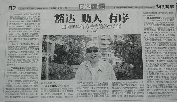 《新民晚报》刊登陈洁夫学长的长寿之道