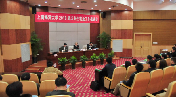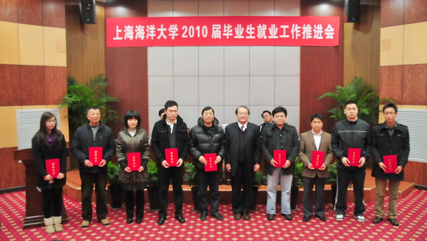 会上,校招生与就业办主任张宗恩报告了2009届毕业生的就业工作和2010届毕业生的就业状态、需求,解读了党和政府的有关政策文件,提出了促进毕业生就业的工作举措;黄硕琳副校长宣读了关于颁发2009年上海海洋大学毕业生就业工作贡献奖的决定;潘迎捷校长向获奖者颁发了就业贡献奖的奖牌、证书;用人单位代表上海爱屋食品有限公司办公室主任戴轶、学院领导代表食品院长王锡昌、教师代表生命学院副教授刘至治、学生组织代表前程工作室负责人周步涛分别做了交流发言;最后,潘迎捷校长做了重要讲话。潘校长的讲话在充分肯定成绩、分享喜悦的同时,也十分表明了大家的担忧。针对世博年的就业工作,他强调了四项要求:一是要实现两个确保(确保就业率不低于去年,确保毕业生就业稳定、和谐);二是要继续推进“八项工程”,做好“6个进一步”(总结去年经验、发动全员参与、争取社会资源、用足就业政策、加强就业指导和提高宣传力度);三是重点关心好5个群体(家庭经济贫困群体、学习成绩差(就业能力匮乏)群体、心理有障碍群体、无就业方向群体、外地生源执意要留沪群体);四是要就业工作服务保障到位。同时他要求全校教职员工统一并加强三个认识:大学生就业是天大的事;全员参与度是做好就业工作的重要保证;做好就业工作是学校的基本任务、战略要求和重中之重。潘校长强调,加强这三个认识是今后做好就业工作必要的思想基础,他要求各部门领导回去后立即行动起来,全力以赴、千方百计做好2010届毕业生就业工作。