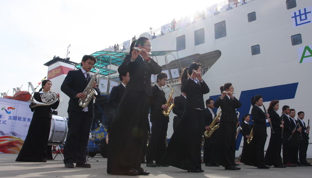 在本次活动中,上海海洋大学管乐团志愿者们身着礼服承担了启动仪式迎宾环节,在展示海洋大学志愿者良好形象的同时还为举行仪式的“新鉴真号”轮、世博志愿者号以及嘉宾等奏起号角!此次活动的背后,我校志愿者不畏寒冷天气加排加练、演出当天清晨6点从临港校区出发,秉着世博志愿者应有的精神,不惧劳累,微笑前行。如今,在这个风和日丽、温暖春风轻拂的江面上,他们用实际行动验证了两星期准备的成果,同时,也表达了心中那份对上海世博会的期盼和向往。