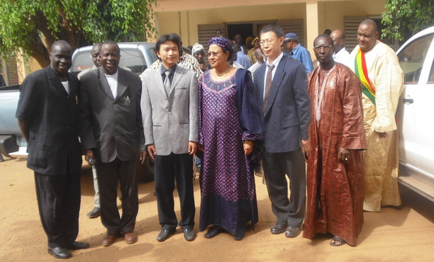 马里畜牧渔业部长(左四)高度称赞我校在中马渔业合作中发挥的作用,图为刘利平博士与部长等合影