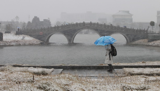 远处的元月桥略显风雪意境