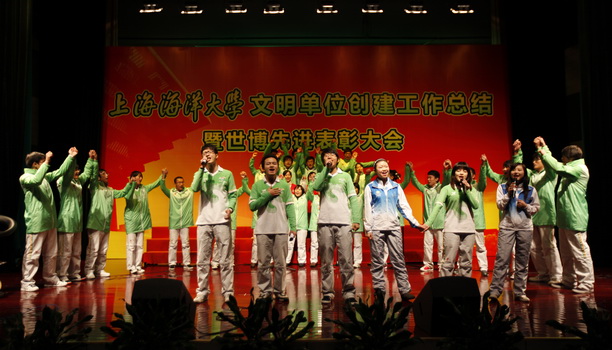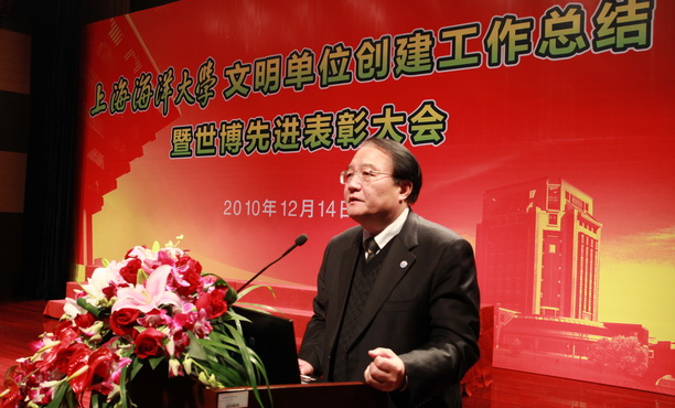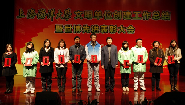 2010年12月14日下午,上海海洋大学文明单位创建工作总结暨世博先进表彰大会在我校学生活动中心报告厅举行,校党委书记虞丽娟、校长潘迎捷,校党委副书记吴嘉敏、校党委副书记、副校长黄晞建、副校长程裕东出席了此次表彰大会,我校各职能部门及学院教师、世博志愿者代表参加了此次大会。