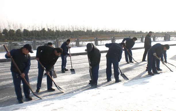 管理处心系大雪将对校区的影响,从15日晚上的21时就由保安部开始组织扫雪,将学校的主干道,各大门不间断的进行清扫。凌晨6时,保洁部、保安部主管已经在现场巡查和指挥员工进行清扫,天寒地冻,当大家还蜷缩在暖暖的被窝里不肯钻出来的时候,紫泰人握着冰冷的扫把和铁锹一点点的刨出道路,苦点、累点、冻点,没关系,尽管大家的手冻僵了、脸冻红了、衣服鞋子也湿了,无所畏惧,为的就是学校师生进教室前,能安全的、开开心心的进入教室,这,就是每个物业保安、保洁、工程和管理人员的心愿。很多学生和老师在进出教室的同时,给员工们甜美的微笑作以回报:“阿姨、叔叔们你们辛苦了,谢谢你们”。 紫泰人的心很暖,斗志更加昂扬。