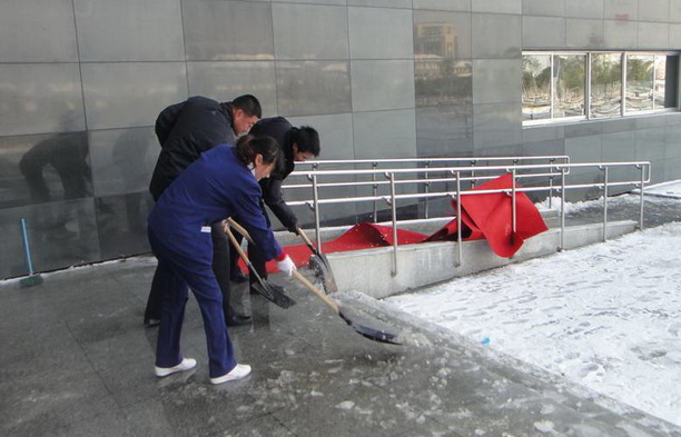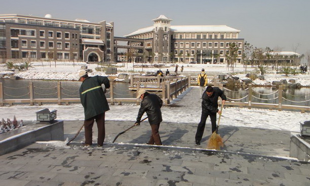 针对雨雪等恶劣天气,公司及管理处专门制定的应急预案在这种时刻立即启动,管理处专门召集各部门负责人召开了紧急会议,具体布置和采取相应的应急准备。办公室负责收集天气预报的信息,及时将信息传送至每个部门负责人。工程部负责对室内外的设备、设施进行防冻检查和处理。保安部负责进出各门岗的人员、车辆减速提醒,夜间组织人员清扫,第二天上课前组织在各教训楼引导。保洁部负责各教训楼、图文楼、主要道路的积雪清扫及铺设防滑地毯。办公室各管理人员分管1教、2教、3教、4教、实验楼等区域,现场组织员工进行扫雪和引导。