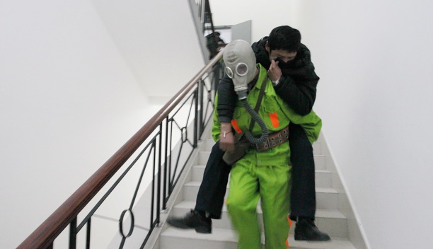 消防队员撤离“伤员”(胡崇仪 摄影)