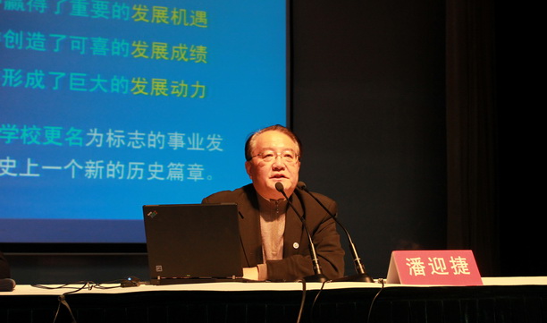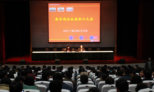 潘迎捷校长作了题为《加强内涵建设 深化改革发展 提升学校实力 以优异的成绩向学校百年献礼》的工作报告。工作报告分3部分:第一部分回顾了“十一五”发展和2010年工作,第二部分布置了本学期的主要工作和任务,第三部分就教职员工关注的的几项工作作了说明。