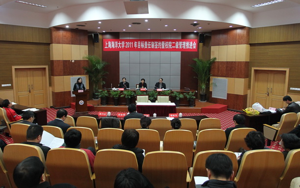 会上,吴嘉敏副书记简要介绍了学校目标责任制的制定情况和校院二级管理进展情况。校长潘迎捷与9个学院(部)签订2011年工作目标责任书,校党委书记虞丽娟和校长潘迎捷分别与机关直属部门代表党委宣传部、研究生部、图书馆签订2011年工作任务书。签约仪式结束后,人事处处长郑卫东介绍了校院二级管理有关情况,并重点解读了《上海海洋大学校院二级管理试行办法》。海洋科学学院院长许柳雄、经济管理学院院长平瑛代表二级管理试点单位,阐述了对试点工作的认识和试点情况。机关党委书记张宗恩强调机关既是考核者,又是被考核者,机关工作人员要切实做好勤务员、运动员和裁判员。