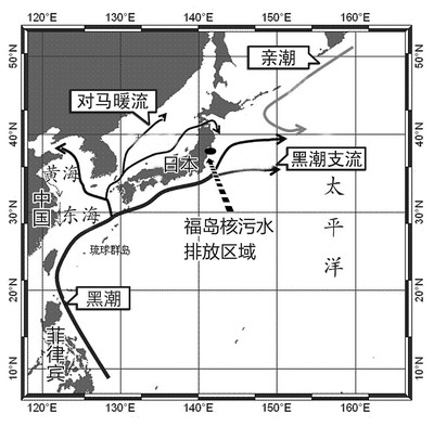 上海海洋大学教授乐美龙认为:日本核污水被排入日本东部沿海,此水域主要海流是黑潮洋流。黑潮是环北太平洋呈顺时针方向流动——从赤道附近自东向西流,在菲律宾东海岸受阻后,沿菲律宾东侧沿岸北上,通过台湾东侧,主流再沿琉球群岛、日本东侧转向东北,沿阿留申群岛南侧,流向加拿大、美国西海岸至赤道附近转向西,成为一个大循环。而另一个次要分支,则经琉球群岛和日本本岛之间进入东海,这股海流一支流经对马岛进入日本海,另一支转向黄海,沿朝鲜半岛西海岸流向黄海北部。从洋流的角度看,福岛核电站泄漏或排出的核辐射污染水体,主要被黑潮带动向西北和东北太平洋一侧扩散。