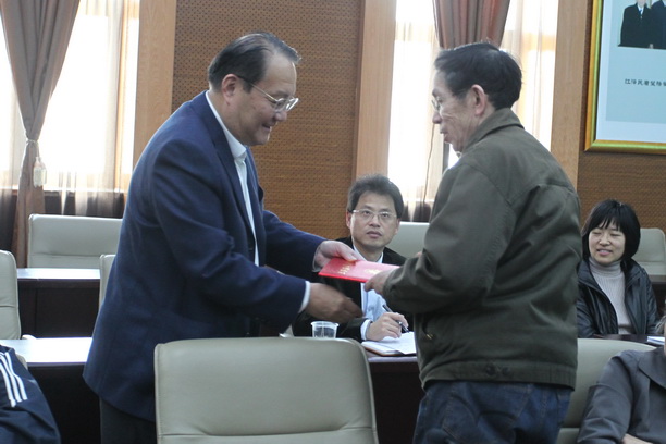 校党委组织部部长汪之和宣读我校2010年度上海市教育系统关工委个人荣誉奖获得者名单、新一届关工委员成员名单、各学院(部)关工委分会成员名单和新增设的关工委顾问组成员名单。潘迎捷校长向市教育系统关工委个人荣誉奖获得者李道恒和陆淑晴老师献花表示祝贺,为关工委顾问组成员颁发聘书。