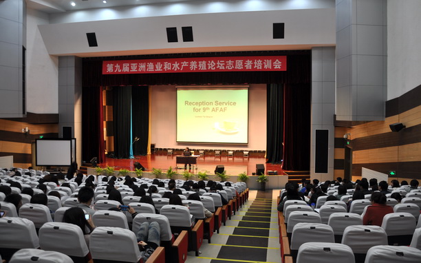 2011年4月12-17日,我校第九届亚洲渔业与水产养殖论坛志愿者专项培训在学生活动中心报告厅举行。来自外国语、生命、海洋、爱恩学院的419名志愿者们参加了此次培训。