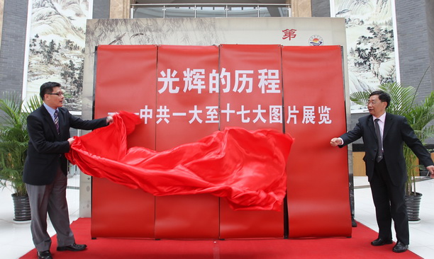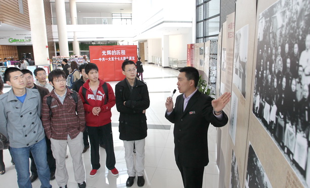 随后,“从一大到十七大”中国共产党光辉历程图片展揭幕仪式举行。虞丽娟书记首先代表学校党委再次对第六届“读书•文化”节的开幕表示热烈的祝贺!对上海中共一大纪念馆向我校输送优质资源,共同开展师生爱国主义教育表示最诚挚的感谢!虞书记在致辞中指出,今年是中国共产党成立90周年,也是实施“十二五”规划的开局之年,明年我校将迎来建校一百周年,学校将紧紧抓住这个契机,积极响应中央和市教卫党委的号召,开展一系列纪念建党九十周年的活动。作为我校纪念建党90周年的活动之一,在第六届“读书•文化节”期间,隆重举办光辉的历程图片展,通过大量珍贵的图片,集中展示90年来中国共产党的发展轨迹和光辉历程,生动形象地展现以毛泽东、邓小平、江泽民、胡锦涛同志为核心的党的四代中央领导集体带领全党、全国各族人民走过的不平凡历程和取得的辉煌业绩,必将对我校广大师生干部产生良好的教育和激励作用,对于进一步增强广大共产党员的荣誉感、责任感和使命感,鼓舞全体海大的教职员工坚定共产主义理想,积极投身百年海大的建设,以实际行动投入创先争优活动,以优异的成绩迎接明年的百年校庆,具有十分重要的意义。“以史为鉴,可以知兴替”。虞书记希望广大的师生党员能充分利用这次送学上门的机会,认真学习和重温党的光辉历史。之后,一大纪念馆常卫建馆长也作了热情洋溢的发言,学生代表海韵沙龙李佳同学也表达了对图书馆的热爱和对“读书•文化”节活动的期待。最后,在一大讲解员的带领下,大家认真地重温了历史。在接下来的一个月中,第六届“读书•文化”节将会带领大家分享一次文化的盛宴,留给大家更多美好的记忆。