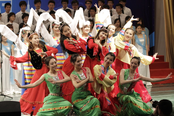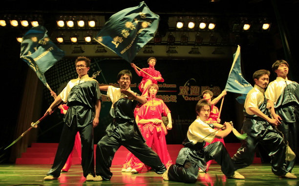 而后,博浪天涯的原创舞蹈《海魂》,来自大草原悠扬的《牧民新歌》,将中华传统文化和中国武术互相结合的《战齐武》展现了当代中国大学生多彩的风貌并迎来了阵阵掌声与喝彩。晚会中,我校第九届亚洲渔业和水产养殖论坛的志愿者们通过原创歌曲和视频的方式给大家展现志愿服务的成长、承诺与责任,更是拉近了专家与海大学子心的距离。一曲《NO EASY》由我校留学生激情演唱,广阔大海连接你我他,即使不在一个国家,但大家追求的都是相同的梦。晚会气氛随之达到最高潮时,美丽的日本《樱花》绽开,在印度尼西亚绚烂的《星星索》下,菲律宾的《孩子》在中国台湾《外婆的澎湖湾》旁,听着韩国的《阿里郎》唱着爱的歌曲,此时,一杯香茗而至,是中国的《茉莉花》——这是由合唱团给大家带来的中外国歌曲大联唱,博得阵阵掌声。