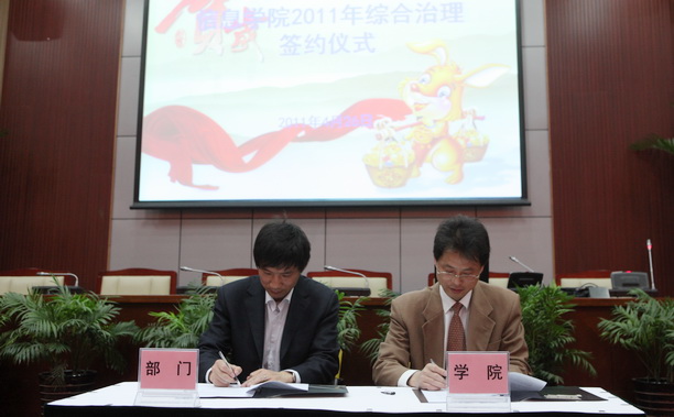 4月26日下午,信息学院在行政楼137会议室召开全体教职工大会暨综合治理签约仪式。在观看了上海市教育系统的安全警示片后,学院综合治理领导小组组长、党委书记施永忠与基层教学组织、实验室负责人代表签署了2011年度综合治理责任书。