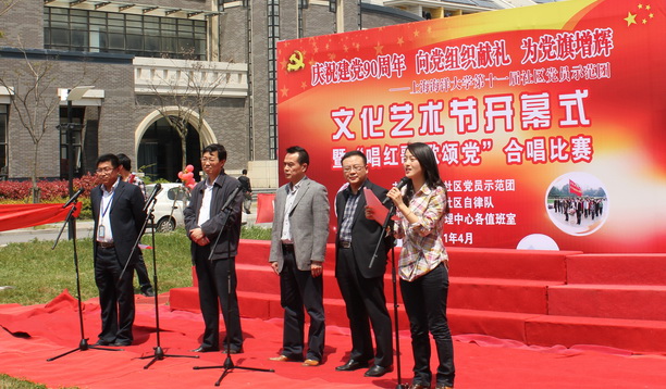 本次文化艺术节以“庆祝建党90周年,向党组织献礼,为党旗增辉”为主题,通过“党建宣传教育和爱党实践活动”两大类11小类的系列活动,开展大学生党员和入党积极份子在社区的党史党性教育,实现“以文化活动加强社区党的建设,开展社区大学生争先创优”的目的,为学校精神文明建设献礼,为建党90周年献礼。示范团学生党员代表汪琪同学在发言中号召学生党员用一颗赤诚与奉献之心,感染一个寝室,辐射一个小区,带动广大社区的同学们一起积极参与文化艺术节各项活动,在社区搭建的舞台上展示风采。
