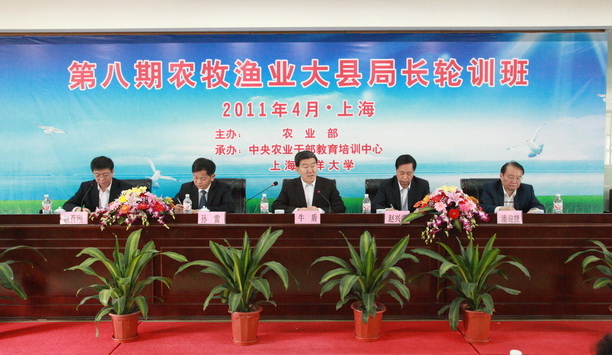 4月25日,第八期全国农牧渔业大县局长轮训班在我校隆重开班。农业部牛盾副部长、农业部渔业局赵兴武局长、上海市农业委员会孙雷主任、上海海洋大学潘迎捷校长等出席了开班典礼。农业部管理干部学院党委书记、院长魏百刚主持开班仪式。