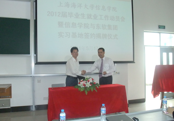5月17日下午,在我校第二教学楼203教室成功召开了信息学院与东软集团就业实习基地签约揭牌仪式暨信息学院2012届毕业生就业工作动员会。东软集团华东大区人力资源部总监张学广、信息学院党委书记施永忠、副书记晏萍、东软集团华东大区人力资源部大学合作经理官雪、计算机公共基础部教研室主任陈庆海老师以及2012届毕业生辅导员出席了仪式。