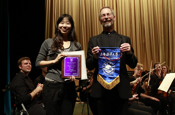 美国犹他州韦伯州立大学交响乐团指挥斐麦克博士与我校团委书记夏雅敏代表两校互赠校旗和礼物