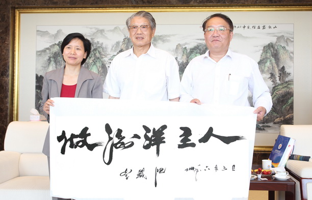 欣闻明年学校将迎来百年华诞,李铁映同志应邀为学校题写贺辞:作海洋主人。校党委书记虞丽娟、校长潘迎捷代表学校接受题词并表示感谢。