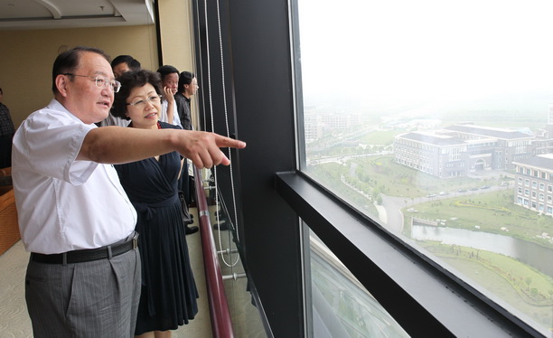 潘迎捷校长陪同吴乾渝副区长在图文中心12楼俯瞰校园