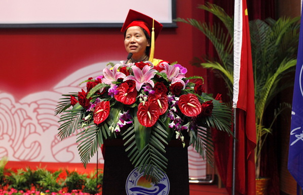 校党委书记虞丽娟在典礼上发表了热情洋溢的讲话。虞书记在讲话中对毕业生表示祝贺,并希望毕业生胸怀理想信念,树立远大志向,接起建设祖国的接力棒,积极投身建设中国特色社会主义事业的伟大实践,将自己的青春贡献给民族振兴的伟业。要记住:勤朴忠实是我们上海海洋大学人最宝贵的精神财富!勇于迎接挑战,勇于承担责任,培养承受挫折的韧性和耐力,把握机遇的敏锐洞察力。要记住:始终面带微笑走向明天!树立终身学习理念,认真阅读社会这本“大书。要记住:没有毕业,只有毕生!最后,虞书记代表学校诚挚地邀请每一位毕业生在百年校庆之际,回到校园共祝百年华诞!