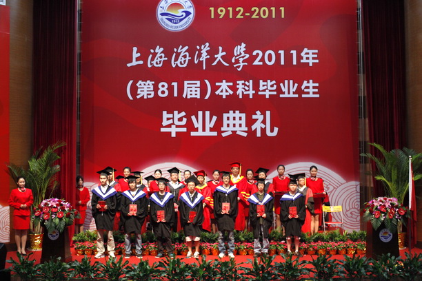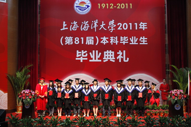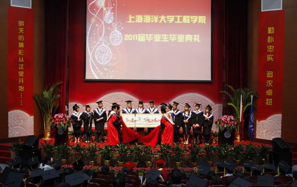 毕业典礼在雄壮的国歌声中正式开始。工程学院院长王世明教授代表工程学院致辞,副院长曹守启宣读关于授予上工程学院第81届毕业生毕业、学士学位证书的决定和名单,出席典礼领导共同为毕业生颁发毕业证书、学位证书,并合影留念。院党委书记王明华宣读表彰个人的决定,招生与就业办主任张宗恩、学生处处长李兴华为获得校优秀毕业生称号的学生颁奖,校领导顾乃达为获得市级优秀毕业生的同学颁奖。