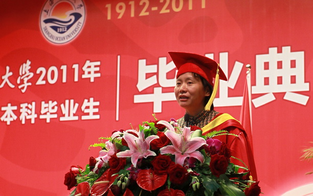 校党委书记虞丽娟教授讲话,她在讲话中,首先向圆满完成学业并获得学士学位的同学们表示热烈祝贺,向为他们成长成才付出大量心血和劳动的全校教职员工表示诚挚敬意,向支持他们奋发成才、长期关注上海海洋大学发展建设的各位家长和亲属们表示亲切问候和衷心感谢;再次,虞书记向毕业生们提了几点希望,希望毕业生们要志存高远、牢记校训、心系母校、报效祖国;最后,虞书记希望毕业生们无论走到哪里,无论从事什么职业,希望大家一如既往地关注母校的建设和发展,为母校腾飞做出贡献。同时,学校也会永远像母亲一样支持你们、帮助你们、欢迎你们,希望大家“常回家看看”,她还与毕业生们相约海大百年华诞时再相见!