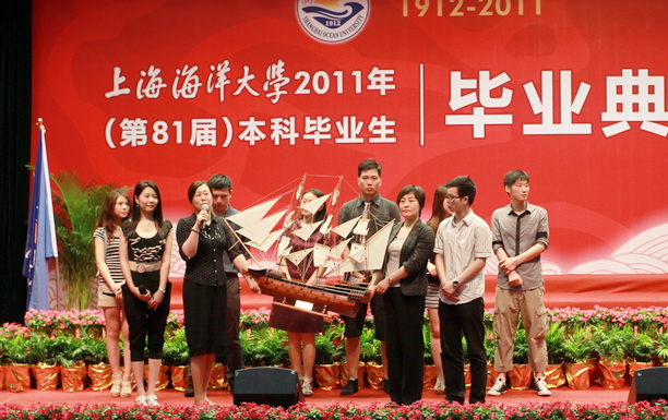 毕业典礼在雄壮的国歌声中拉开了帷幕。学院院长平瑛教授宣读《上海海洋大学学位评定委员会关于授予学士学位的决定》,校党委书记虞丽娟教授、校学位委员会委员和学院学位委员会委员们一起为毕业生颁发毕业证书和学位证书。学院党委书记岑伟平副教授宣读《关于表彰2011年“上海海洋大学优秀毕业生”暨“上海市普通高等学校优秀毕业生”的决定》,校党委书记虞丽娟教授为获得优秀毕业生代表颁发了荣誉证书。上台领取学位证、毕业证书,与校党委书记虞丽娟教授等校学位评定委员会合影留念,是每位毕业生最向往的神圣时刻,也是每位学生家长最盼望看到的时刻。沉甸甸的毕业证、学位证,见证了同学们奋斗的足迹、激扬奋发的青春豪情,更蕴涵着他们灿烂美好的明天;与虞书记等学位评定委员合影留念,不仅见证了毕业生最庄严的瞬间,也标志着学子们圆满完成学业,从此开始迈上新征程。家长看到孩子上台领取学位证、毕业证书,激动的两眼红润,自豪之情也油然而生,因为父母最大的心愿莫过于看着自己的孩子学业有成,成为有益于国家和社会的栋梁之才。紧接着,播放了毕业生在校期间生活点滴的VCR,记录了在美丽校园里的很多难忘的青春之旅:教室里有他们凝神思索的画面,图书馆里有他们刻苦努力的身影,操场上有他们灵活矫捷的身姿,宿舍里有他们的欢声笑语……毕业生代表徐李雪烛等六名同学以歌曲联唱的形式表达了对母校、对恩师、对家长的感激之情,绝不辜负他们的厚望,努力成为国家建设的栋梁,为父母、为母校争光添彩!随后毕业生代表向学院赠送了毕业礼物——帆船,学院院长平瑛教授和学院党委书记岑伟平副教授代表学院接受了同学们的深情厚意,一艘帆船寓意着毕业生祝福母校在今后的发展中乘风波浪,再创佳绩。学弟学妹代表表演了校园情景剧,送上他们对学哥学姐们的真挚祝福,祝他们一路走好,并以他们为榜样,今后在校更加努力学习,不断提升自己的各种能力,以便更好地适应社会、服务社会、奉献社会。现任上海医药旗下上海中西三维药业有限公司财务经理、团委书记、工会经审委主任,我院2006届会计学专业毕业生任丽莉代表校友发言,她用热情洋溢的言语,结合自己的亲身经历感受,将美好的祝福送给了即将毕业、走上工作岗位的师弟师妹们,祝他们事业有成、生活幸福!食品经济管理专业刘鲁艳的父亲刘敏宏先生作为家长代表发言,他在发言中感谢学校和老师对学生的悉心培养,告诫孩子们常回母校看看,牢记老师的教导之情,莫忘同窗的珍贵情谊!学院领导和教师代表杨德利、郑锦荣、王晓静、刘华楠四位教授以配乐诗朗诵的形式向全体毕业生们致辞,引起了全场的共鸣,在毕业生心目中留下了难忘的记忆。