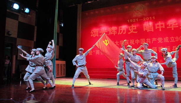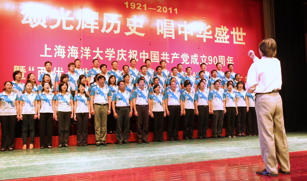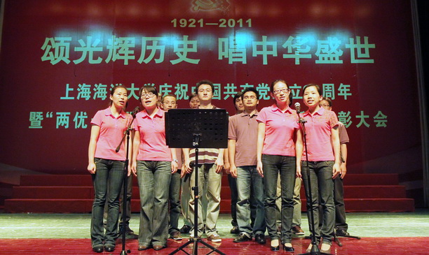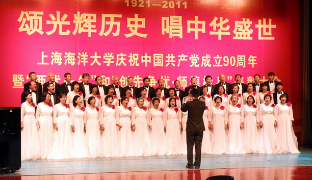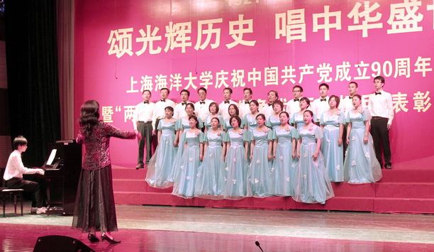 纪念建党90周年暨“两优一先” 和“创先争优·师德标兵”表彰大会第一阶段议程完成后,“颂光辉历史,唱中华盛世” ——上海海洋大学庆祝中国共产党成立90周年文艺演出拉开序幕。教师合唱团合唱的《夕阳红》、《祖国 慈祥的母亲》;研究生表演的《映山红》;后勤服务中心的舞蹈《长征》;信息学院老师合唱的《精忠报国》;新疆班学生的舞蹈《欢乐》;老年东方艺术团表演的《满江红》、《你永远在我心中歌唱》;教工舞蹈团的《You raise me up》和机关教工合唱团的《爱我中华》等精彩节目赢得阵阵掌声和喝彩。最后,在《歌唱祖国》的优美旋律中把庆祝会的气氛推向了高潮。