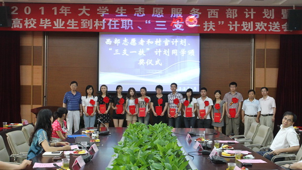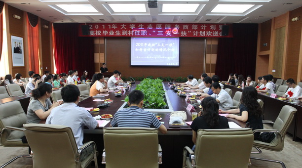 6月29日上午10点,上海海洋大学大学生志愿服务西部计划暨高校毕业生到村任职、“三支一扶”计划欢送会在图文信息中心102会议室隆重举行。校党委副书记、副校长黄晞建、组织部、宣传部、招毕办、学生处、研究生部相关负责人、各学院党委副书记、就业指导员、2011届参加国家和地方项目的毕业生出席了本次欢送会。会议由校团委书记夏雅敏主持,