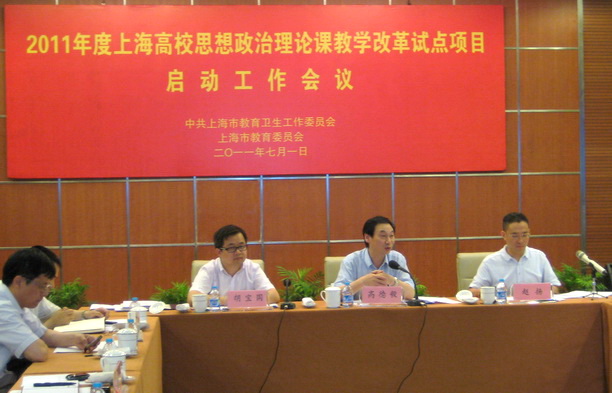 新一轮上海市思想政治理论课教学改革试点项目启动工作会议于7月1日上午在上海电视大学文会楼一楼多功能厅举行。市教卫党委宣传处处长赵扬主持会议,市教委德育处处长胡宝国介绍了试点项目产生的过程。复旦大学、上海交通大学、华东理工大学、上海海洋大学、上海大学和上海电子信息职业技术学院等6所高校最终获得新一轮思想政治理论课教改试点项目。市教卫党委副书记、市教委副主任高德毅出席会议并讲话。我校党委副书记、副校长黄晞建和社会科学部主任董玉来参加启动仪式并简要汇报了我校试点方案。