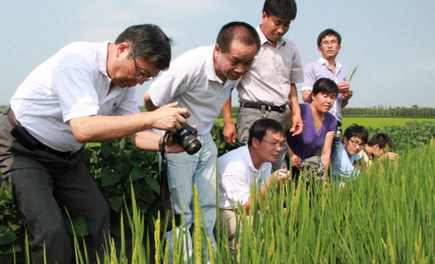 8月4日一天,王武教授一行赴我校在坝墙子镇姜家村的稻田种养试验基地,首先慰问了基地的研究生,并听取了他们的工作汇报,然后对70亩试验基地各试验小区的试验内容进行了检查。当大家看到对照组(不养蟹稻田)与养蟹稻田的差距,看到项目组提出的一穴单株栽插好于传统的一穴多株栽插,看到项目组引种我国目前评价最好的大米——“宁粳43”,其分蘖多、稻穗长,的确名不虚传;目前试验基地的水稻和成蟹的长势喜人。大家十分兴奋,纷纷对下一阶段的试验工作提出众多建议和做法,并确定了下阶段的试验研究方案。