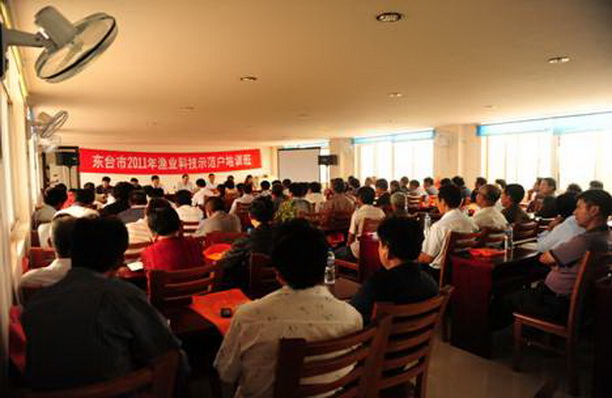服务团第二站在江苏省东台市,东台市淡水资源丰富,以养殖常规鱼、南美白对虾、罗氏沼虾、河蟹为主。服务团参加了由东台市海洋滩涂与渔业局牵头举办的“东台市2011年渔业科技示范户培训班”,在培训班上,杨先乐教授进行了《水产品质量安全与渔药的规范使用》的报告。针对与会的成员都是水产养殖户,他们需要的是实际可应用于养殖上的知识和技术。杨先乐教授通过通俗易懂的语言,讲述养殖过程中出现的一些具体事例,同时结合当地的生产实践,提醒养殖过程中用药安全需注意的问题,更以生动的图片直观地展示各种鱼病的病征,提出切实可行的治疗方法。讲到精彩之处,与会的养殖户们都频频点头并及时做笔记。会议休息期间,与会的养殖户围着服务团带去的展览板,不时进行讨论并向服务团咨询。会议结束后,有不少养殖户走到台前向杨教授请教他们在养殖过程中,养殖鱼体出现的一些问题,杨教授都为他们作出解答。