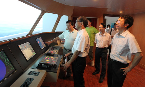 张明沛厅长在模拟航海室体验海上“航行”