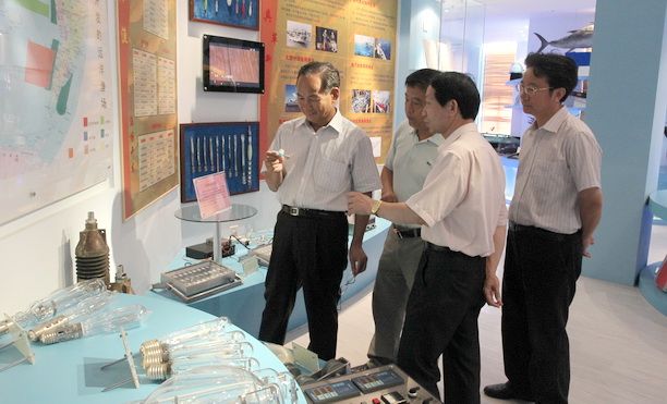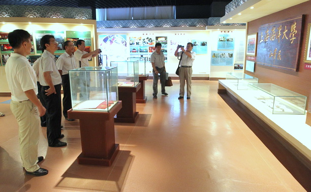 座谈前封金章副校长陪同张明沛厅长一行参观远洋渔业展示厅