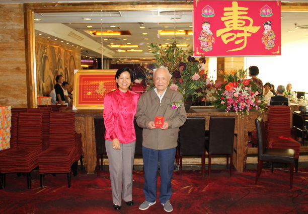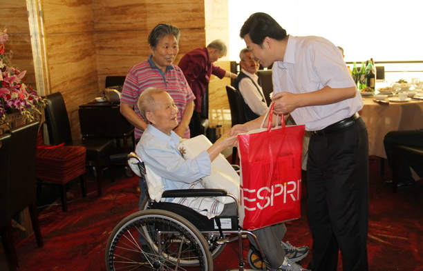 吴嘉敏副书记向离休老同志赠送生日礼物
