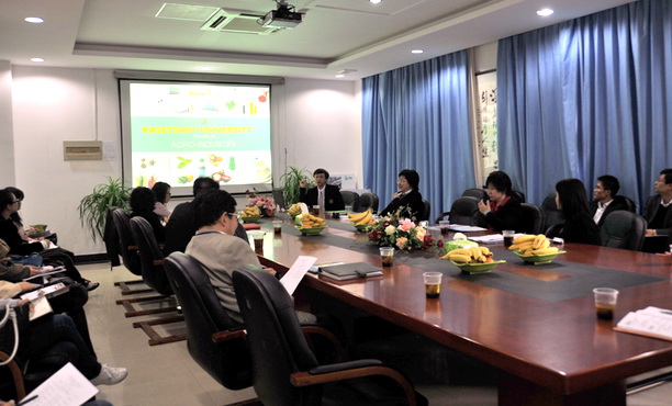 首先,王院长代表食品学院对国外专家的远道而来表示欢迎,并向嘉宾们逐一介绍了到会的教师代表。随后,谢晶副院长向大家简要介绍了食品学院近年来在学科建设、人才培养、学术交流与科学研究等方面的基本情况。Siree Chaiseri院长也对泰国Kasetsart大学农工学院的情况作了介绍。农工学院主要由农业技术系、生物技术系、食品科学与技术系、包装技术与材料系、产业发展系、纤维科学系等6个部分组成,重点在米制品加工、食品安全、食品风味、植物化学与功能性食品、食品蛋白衍生活性物质、食品胶体与生物聚合物、食品加工工程与仿真等领域开展研究工作,在食品研发上具有多年的发展历史与学科特色。交流期间,主宾对方探讨了两校间在食品学科研究领域所具有的优势,并提出开展后期交流合作的可能性,表达了愿与我校就科学研究、人才培养和学科建设方面共同合作的强烈意愿。