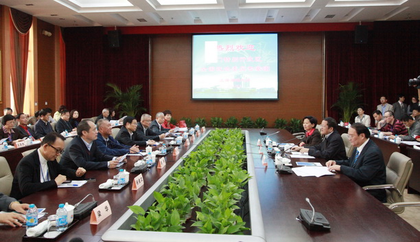 上海市教委薛明扬主任在图文信息102会议室向考察团介绍了上海市大学园区的建设和发展概况。