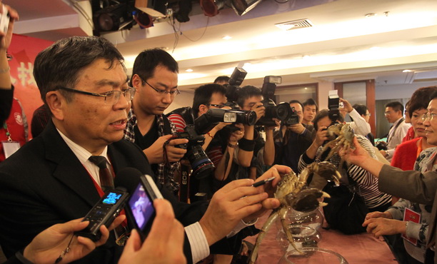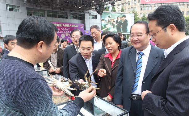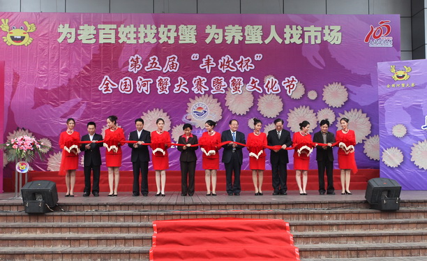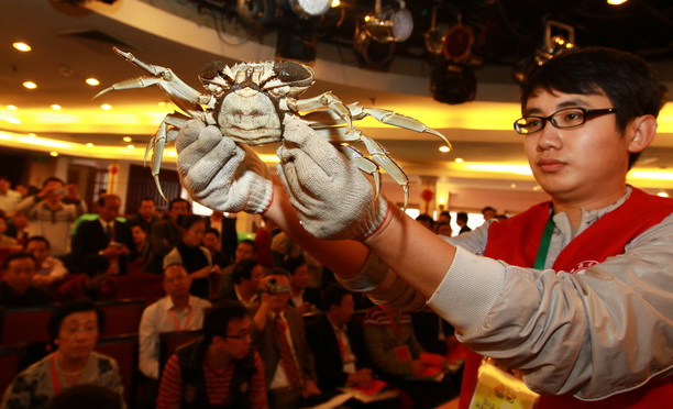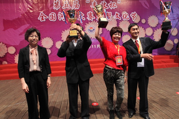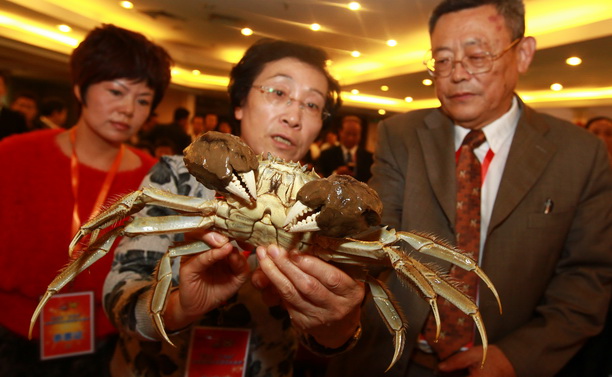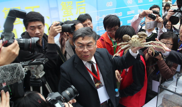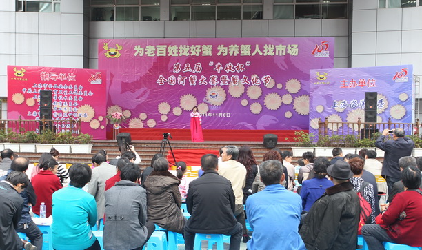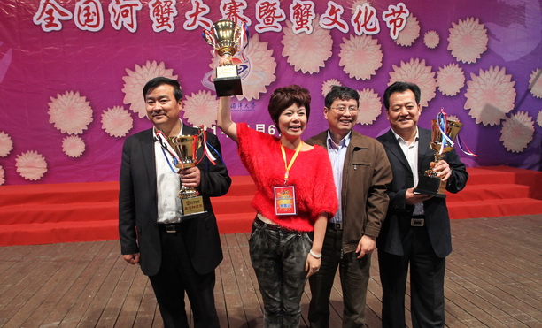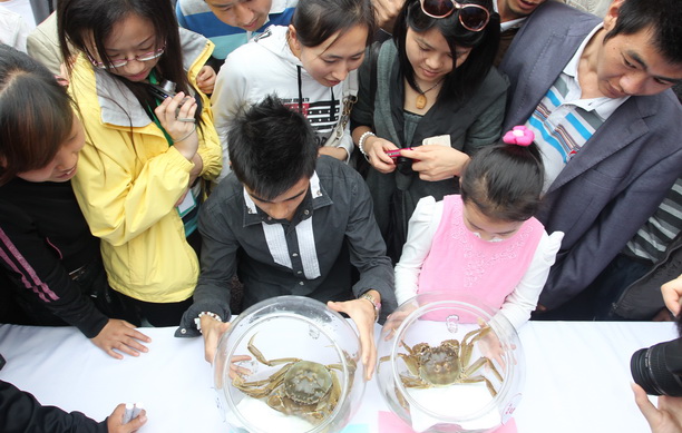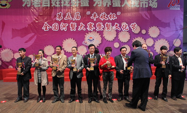 11月6日,上海海洋大学主办的蟹文化节在南京路世纪广场开幕,第五届“丰收杯”全国河蟹大赛同时摆下擂台,来自上海、重庆、江苏、安徽、浙江、江西、山东的40余家养蟹企业选送的近千只河蟹角逐蟹王、蟹后头衔和金蟹奖、最佳种质奖、最佳口感奖。经过激励角逐,来自江西进贤、江苏苏州等地的河蟹获得最佳口感奖,江苏太仓、上海等地的河蟹获得金蟹奖,由安徽皖宜季牛水产养殖有限公司选送的616.3克雄蟹和江西进贤皖赣特种水产开发公司选送的重达390.3克的雌蟹,获得 “蟹王”、“蟹后”称号。