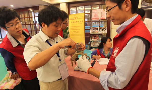 工作人员展示“蟹王”“蟹后”大赛的参赛蟹(裴鑫 摄)