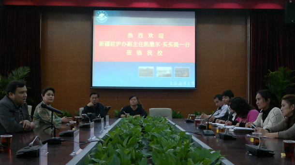 2011年11月4日,新疆驻上海办事处副主任凯撒尔•买买提一行来校看望慰问新疆培训班学员,给学员们带来了党和政府对古尔邦节日的问候,之后与学员进行亲切座谈。封金章副校长,驻沪办经联处副处长尼鲁帕尔,市合作交流办杨小明,浦东新区合作交流办副处长蒋晓风出席座谈会。