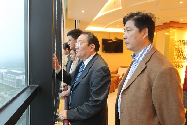 校领导陪同来宾在图文信息中心12楼俯瞰校园