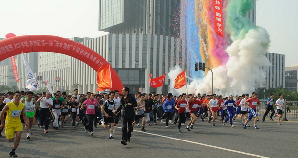 “滴水湖杯”环湖跑活动项目要求参加跑步的选手环绕滴水湖一周,全程达8300多米,这对参赛者的体力和耐力是个严峻的挑战。比赛当日的滴水湖畔,风和日丽,秋色怡人,参赛的运动员个个精神抖擞,英姿勃发,在浦东新区人大副主任谭林福的发令枪声下,从庆典广场出发,环滴水湖沿岸,健步如飞穿行在蓝天绿水之间,,为滴水湖的景色平添了一份运动的美感。我校参加环湖跑的师生们更是着装整齐、满怀豪情,他们发扬勇于挑战、拼搏进取精神,以坚强毅力跑完了整个赛程。其中,人文学院青年教师魏永锋奋勇争先、发挥出色,以35分01秒的成绩获得了首届“滴水湖杯”环湖跑活动第22名。
