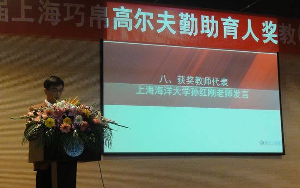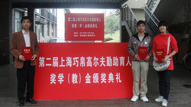 颁奖大会上,上海巧帛高尔夫球队领导和上海市高校勤工助学协会(筹)秘书长徐美华老师分别介绍了奖励设立的初衷以及评选情况,同济大学学生处副处长宋波老师宣读了获奖者名单,我校教师孙红刚作为获奖教师代表进行了发言,最后上海市教育发展基金会阮光明副秘书长总结发言,勉励获奖同学学会感恩,自强不息,为社会发展做出更大贡献。上海市巧帛高尔夫勤助育人奖(教)学金是由上海市教委学生处牵头,上海巧帛高尔夫球队出资,上海市教育发展基金会和上海市高校勤工助学协会(筹)共同管理,专为奖励上海市高校负责帮困、勤工助学工作的优秀教师和家庭经济困难、积极参加勤工助学活动,表现突出的学生而设立的专项奖励金。