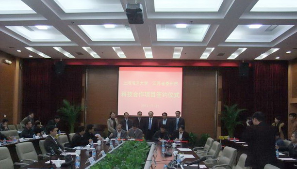 泰州市廖涛副市长首先对泰州市的基本情况做了概述,并指出,泰州有一万多条河,兴化县的水产养殖占地比例很大,在水产养殖上有很大优势,目前泰州市希望将合作上升到政府层面,把农业的产业发展作为重点来做;兴化县是养蟹大县,既有优厚的自然条件,又有市委政府和企业的支持,相信与上海海洋大学的合作会圆满成功。