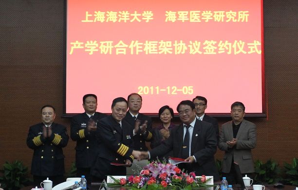 2011年12月5日下午,上海海洋大学与海军医学研究所《产学研合作框架协议》签约仪式在我校图文信息中心102室举行。海军医学研究所陶永华所长、张建副所长以及医学研究所各部室负责人,我校党委书记虞丽娟教授、副校长黄硕琳教授、相关学院院长,研究生部、人事处、科技处等部门负责人和相关教授代表,出席了签约仪式。签约仪式由校办主任张敏教授主持。