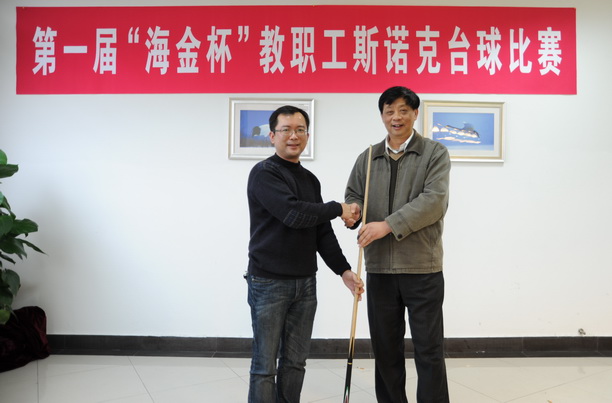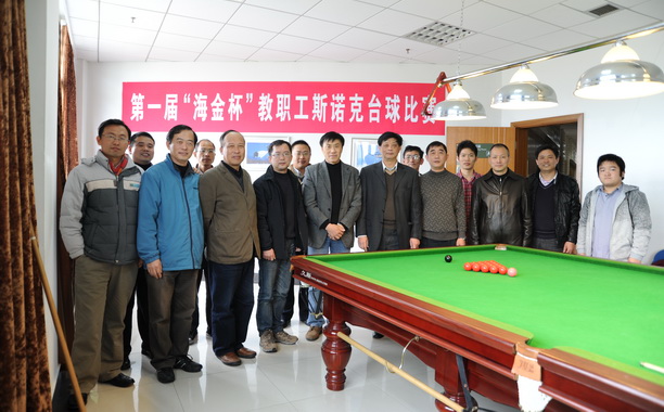 我校第一届“海金杯”教职工斯诺克比赛于2011年12月6日—8日在校工会台球室举行。作为99周年校庆系列比赛之一的斯诺克比赛吸引了众多斯诺克爱好者的参与,报名参赛选手20余人。教职工台球协会名誉会长顾乃达副巡视员和校工会专职副主席高健老师应邀出席开幕式。