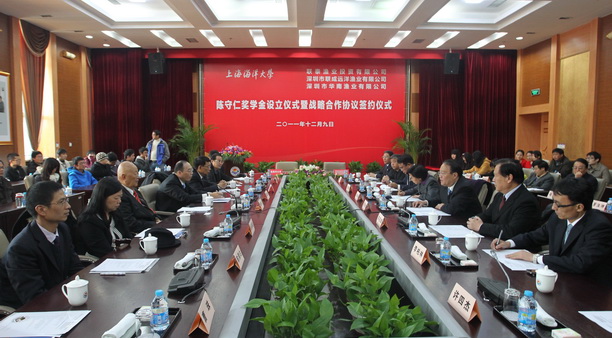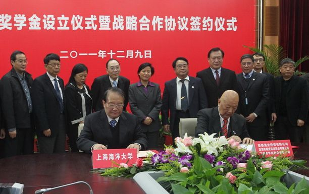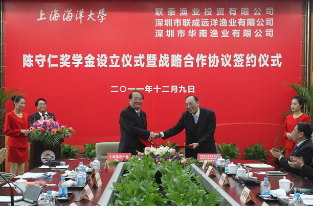 12月9日上午,上海海洋大学陈守仁奖学金设立仪式暨上海海洋大学与联泰渔业投资公司、深圳市联成远洋渔业有限公司、深圳市华南渔业有限公司战略合作协议签约仪式在我校图文信息中心102隆重举行。陈守仁基金会主席陈守仁博士,香港联泰渔业营运总裁、联成远洋渔业有限公司董事长周新东先生,陈守仁主席的女儿、周新东营运总裁的太太陈莉莉女士,陈守仁基金会总干事李和协、华南渔业有限公司董事长黄富雄、联成远洋渔业有限公司副总经理陈清白、联成远洋渔业有限公司IT总监沈介然、联成远洋渔业上海分公司总经理曹珠,校党委书记虞丽娟、校长潘迎捷、副校长黄硕琳、校教育发展基金会理事长周应祺、相关部门负责人、教师和学生代表参加仪式。仪式由黄硕琳副校长主持。