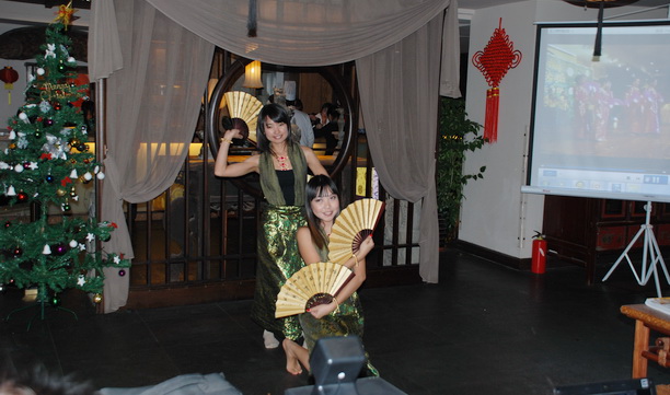 茶艺表演结束以后,投影仪上显现出泰国留学生们的一张张笑脸,他们讲着一口流利的汉语,一一亮相,向同学和老师们送上他们节日的问候。随后,悠扬婉转的民族音乐应声而起,一对来自泰国的姊妹花,身着精致华丽的民族服装上场,用她们优雅的舞姿为我们诠释了一个浪漫而神秘的泰国。紧接着,越南、蒙古、韩国及尼泊尔等国的留学生们一一上场,展示着他们精心制作的PPT、VCD或者VCR,他们用心收集的许多照片,不时引来场下阵阵掌声和喝彩声。帅气的主持人李云团用他浑厚的男中音演唱了《莫斯科郊外的晚上》;宿舍楼管员刘天盈老师为大家表演了热辣十足的肚皮舞;来自坦桑尼亚的哈吉.玛卡姆和来自新疆的中国学生完美搭档,共同上演了即兴饶舌;学院教师蔡莉、潘桂妮及助教武洁的一段传统扇子舞,一出场即引起在座所有留学生的高声尖叫,将现场气氛带入高潮;2011级研究生汉语班用中英文演唱的《月亮代表我的心》,表达了全体留学生对老师、对海大的深切感情;红格朱拉演唱的蒙古歌曲将蒙古草原特有的歌声诠释得空灵悠远。晚会在全体师生共同演唱的《铃儿响叮当》中画上了完美的句点。